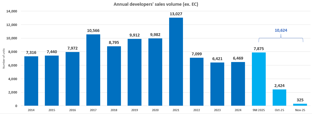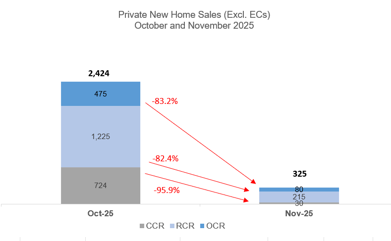 15 December 2025, Singapore - New private home sales fell sharply in November after posting an 11-month high sales volume in October. Developers' sales plunged by 86.6% to 325 units (excluding executive condos) in November - down from the 2,424 units shifted in October - amid fewer new project launches in the month. On a year-on-year basis, developers' sales declined by 87.3% from the 2,560 units transacted in November 2024.